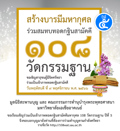 มูลนิธิสะพานบุญ และ คณะกรรมการทำนุบำรุงพระพุทธศาสนามหาวิทยาลัยเอเชียอาคเนย์ และ บริษัทบอสตันเน็ตเวิร์ค จำกัด ขอเรียนเชิญร่วมเป็นเจ้าภาพทอดกฐินสามัคคีมหากุศล 108 วัดกรรมฐาน จึงขอบอกบุญมายังท่านที่ต้องการร่วมทำบุญตามกำลังศรัทธา
